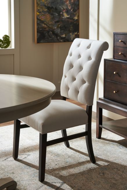 The Berwyn Dining Chair is designed to elevate your living space with sophisticated style and elegance. With its' button-tufted backrest and generously cushioned seat, this chair offers comfort in addition to its' elegant look.
