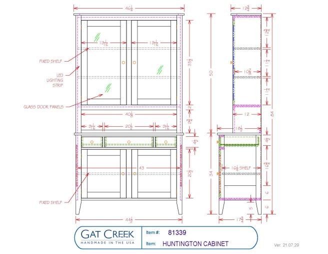 We love the efficiency of the Huntington Cabinet. It offers all kinds of storage but requires only a modest amount of space. The lighted top section offers great space to display dished and serving ware. The buffet is a storage machine with adjustable wood shelves behind beautiful, solid-wood doors.