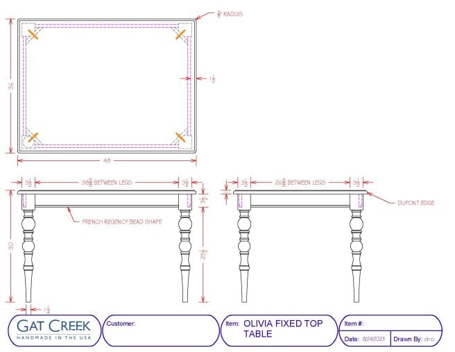 The beauty of the Olivia Table is most present in the exaggerated details. A unique design story is told by curvy legs shaped by an alternating turned ball and cove design detail. The bead tracing the lower edge of the apron and tabletop corners sporting a round-ish radius complete the hearty tale.