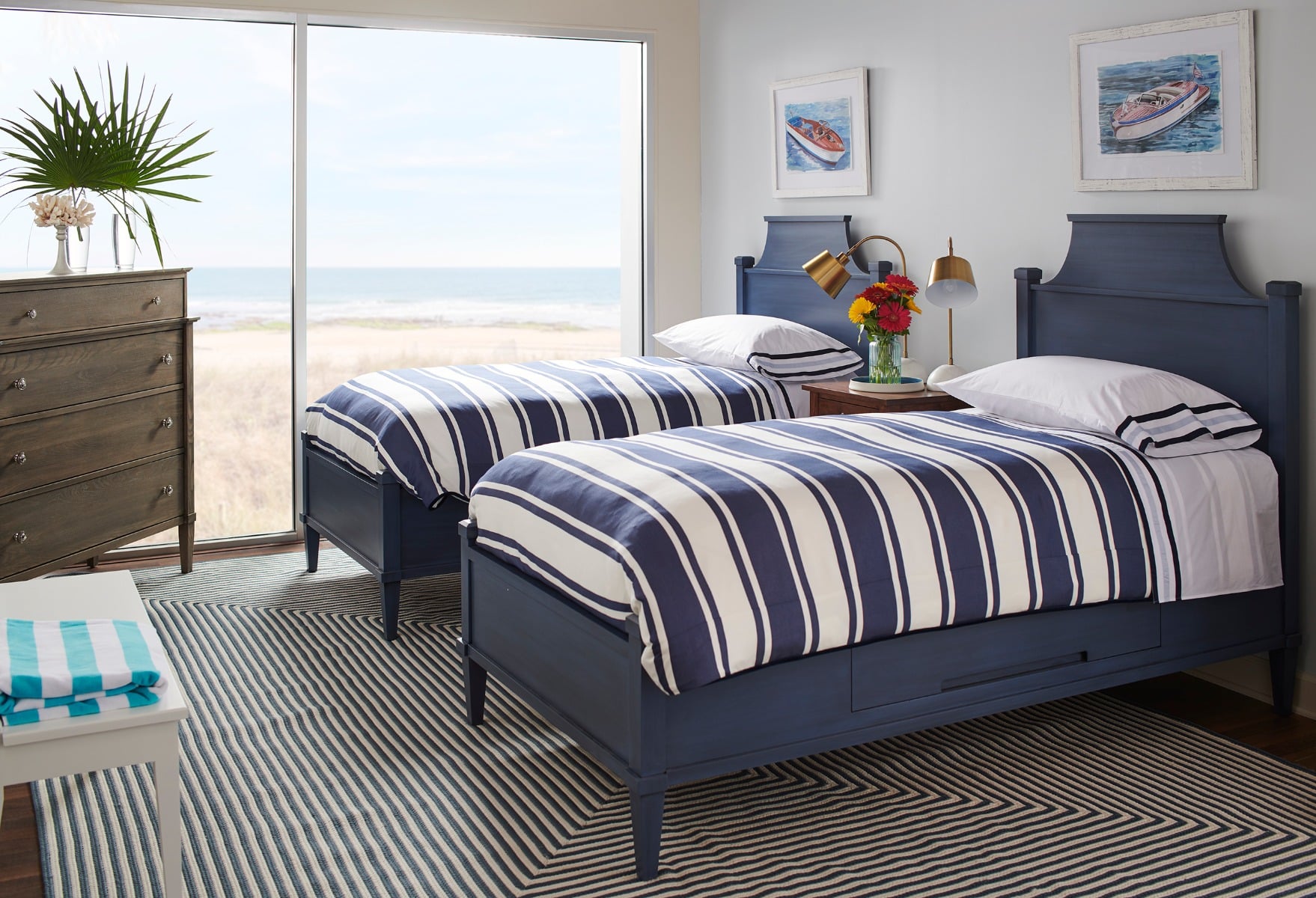 • A handcrafted solid wood bed frame with a gracefully curved headboard and matching wooden nightstand in a bright, serene bedroom overlooking a scenic lake.