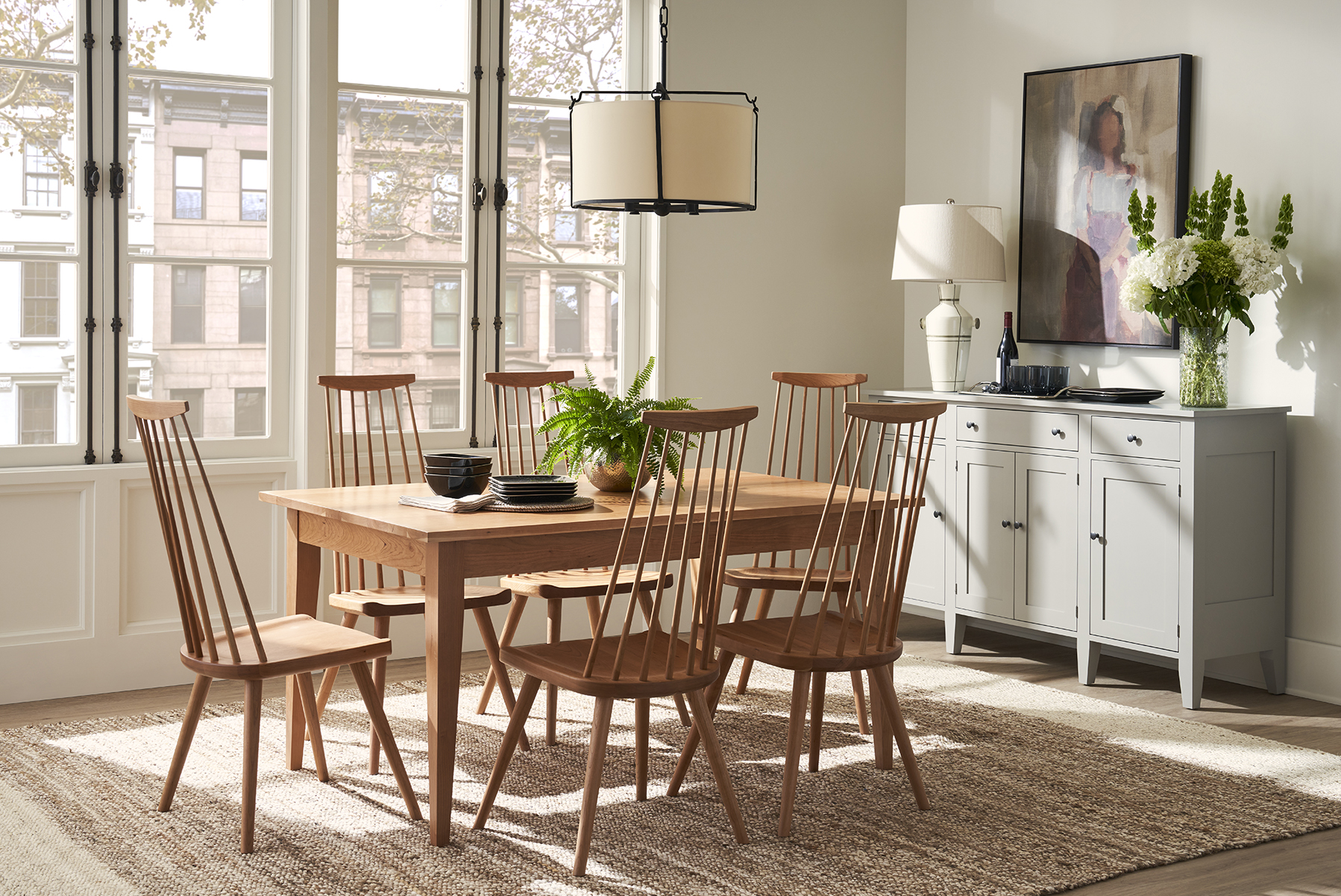 • Contemporary buffet featuring a clean-lined design with ample storage, complemented by a vase of hydrangeas and green stems.